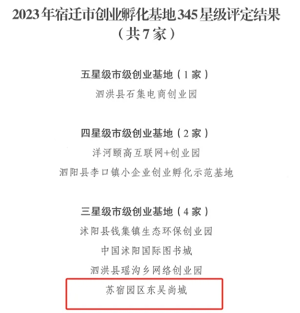 近日,2023年宿遷市創(chuàng)業(yè)孵化基地345星級(jí)評(píng)定結(jié)果發(fā)布,宿遷市蘇宿園區(qū)建設(shè)發(fā)展有限公司服務(wù)項(xiàng)目園區(qū)公舍東吳尚城創(chuàng)業(yè)孵化基地榮獲2023年宿遷市創(chuàng)業(yè)孵化基地三星級(jí)稱(chēng)號(hào)。