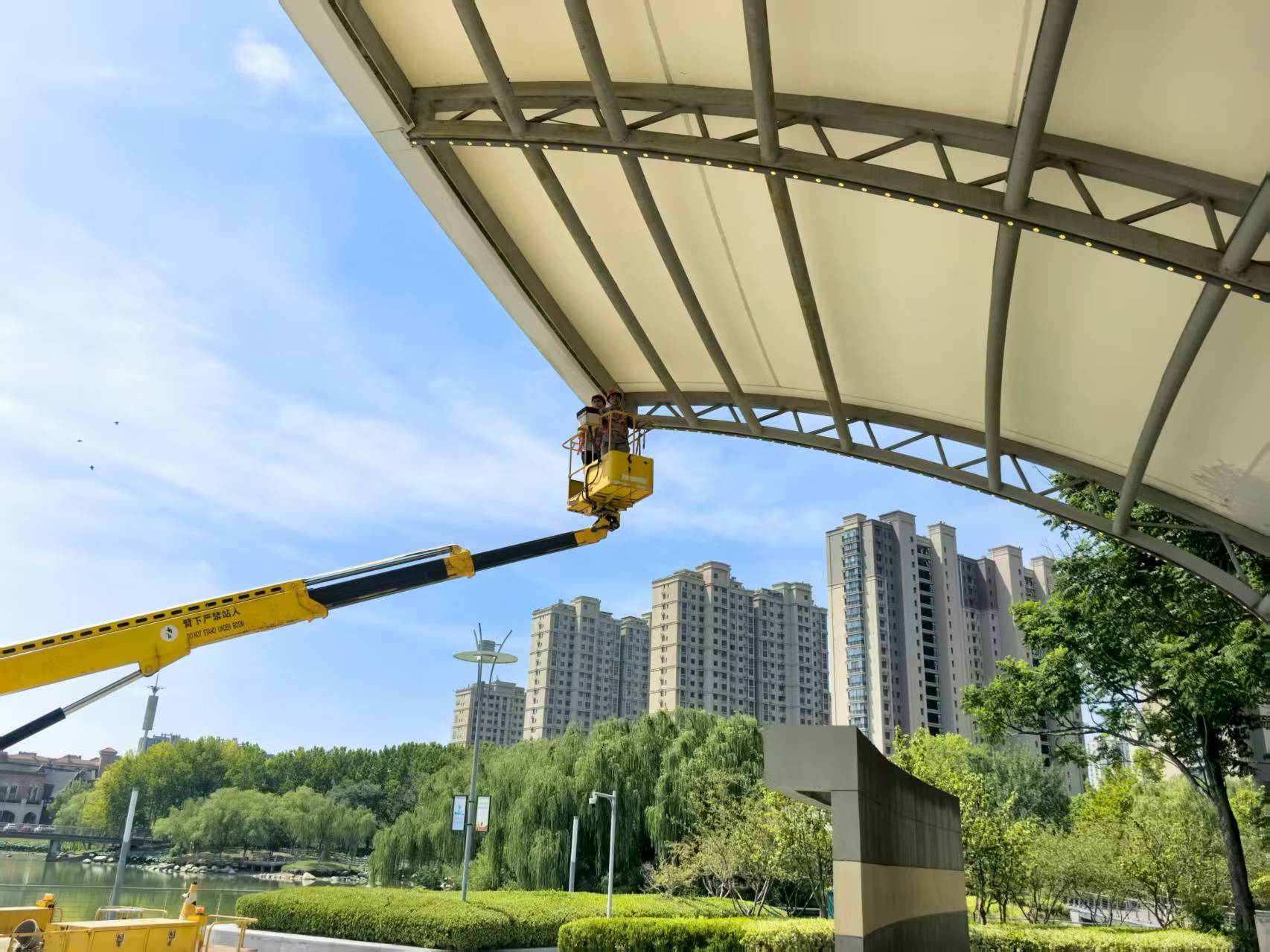 “今天在蘇州公園大舞臺進行登高作業(yè),維修頂部燈光。注意作業(yè)平臺與頂棚保持安全距離……”8月20日上午9點,夏日驕陽似火,蘇州公園作業(yè)現場氣溫已接近37℃。園區(qū)機電維護項目部技術負責人沈剛強和同事們開始了當天的第一場高空維修。