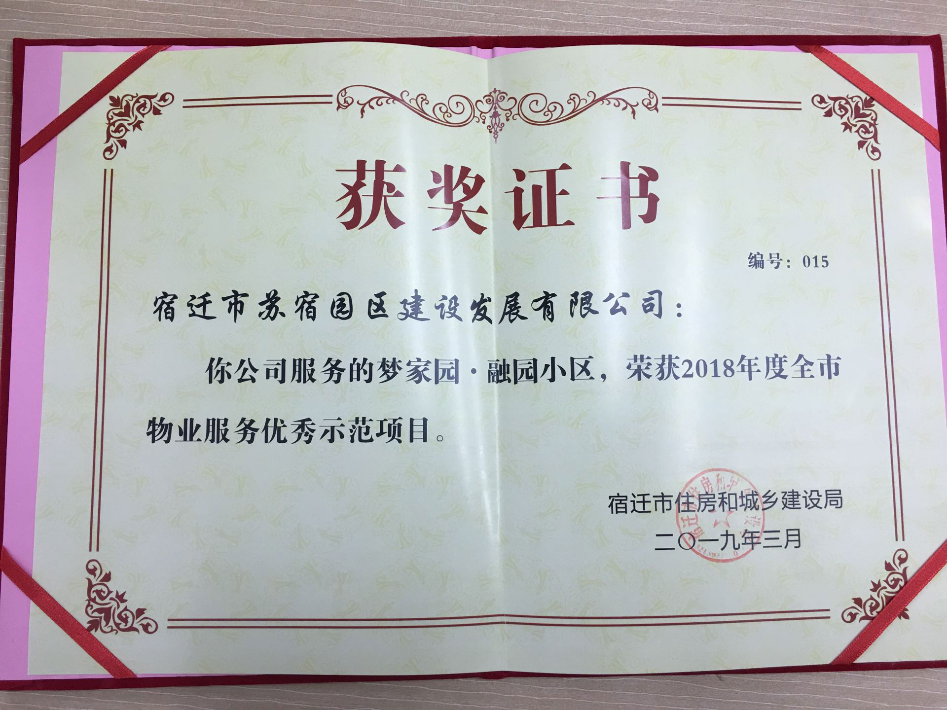 2018年12月,在宿遷市房管局及市物業(yè)管理協(xié)會(huì)組織的全市物業(yè)管理項(xiàng)目考核評(píng)比活動(dòng)中,夢家園.融園喜獲“2018年度全市物業(yè)服務(wù)優(yōu)秀示范項(xiàng)目”。