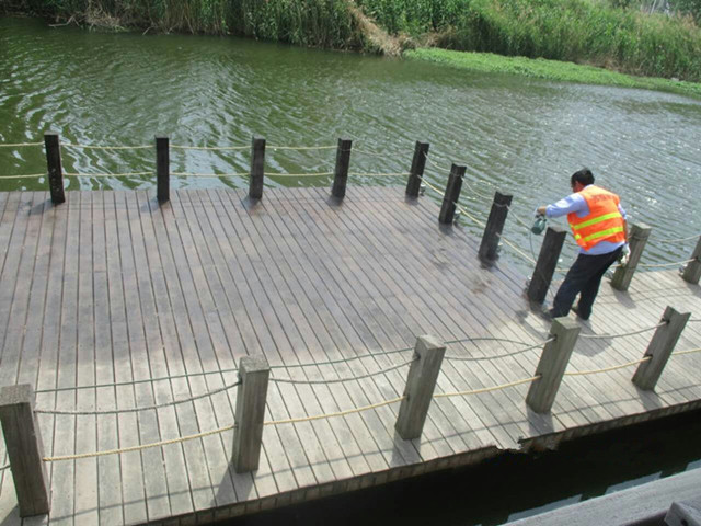 維保工作首先從為民河公園開始。為民河公園于2012年12月竣工投入使用,為園區(qū)最早建成的景觀公園之一。公園內(nèi)有賈拉木棧道約570平方米,硬木扶手、欄桿約402米。隨著使用年限增加,公園部分設(shè)施特別是木棧道、親水平臺(tái)等逐漸發(fā)生了老化,木材表面出現(xiàn)不同程度的褪色和裂紋,影響了親水平臺(tái)的景觀效果。為此,公司先安排維保人員對(duì)破損處進(jìn)行維修,然后清掃干凈噴漆,待自然晾干后再開放通行,給親水平臺(tái)穿上了新“嫁衣”。